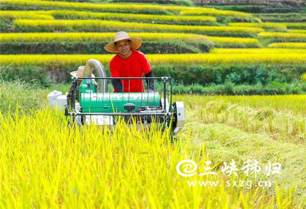 三峡秭归讯(通讯员 王罡 李尧鑫)时下,秭归县高山水稻进入丰收季,收获稻谷的无人机和收割机、层层叠叠的橙黄梯田与农民喜悦的笑脸交相辉映,构成一幅幅金秋喜迎丰收的乡村画卷。