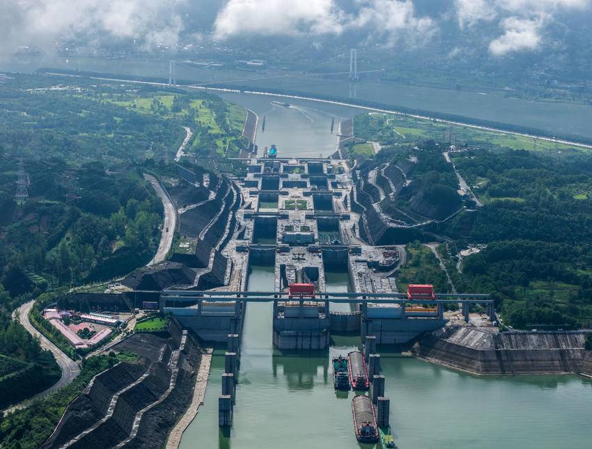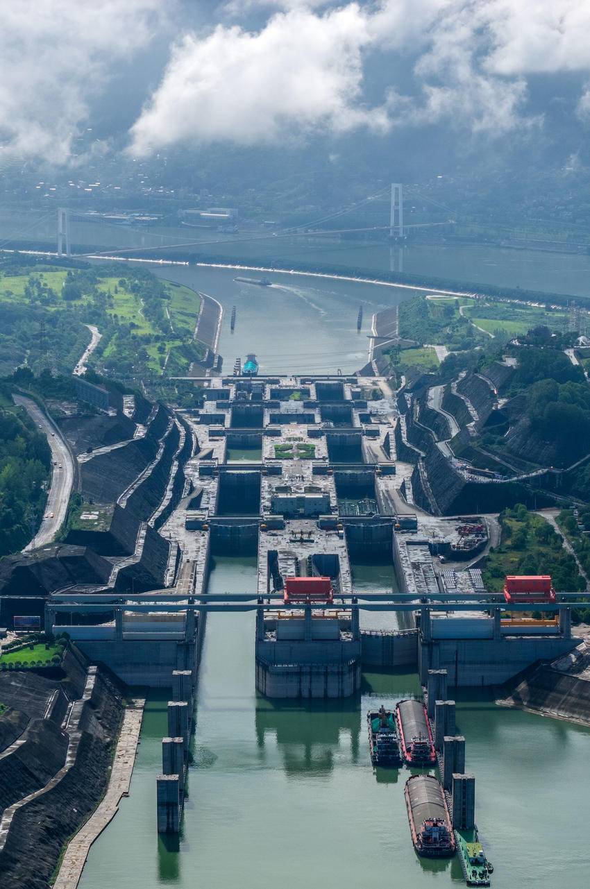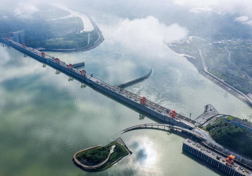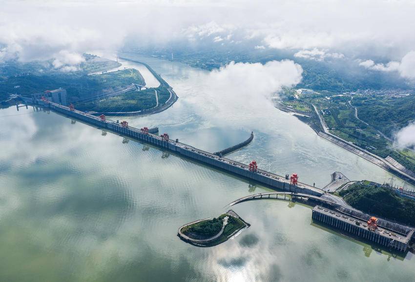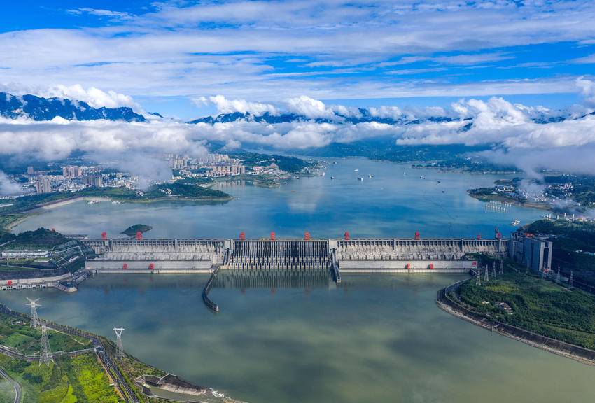 8月13日,在湖北省宜昌市,船舶有序通过云雾缭绕的三峡枢纽(无人机照片)。