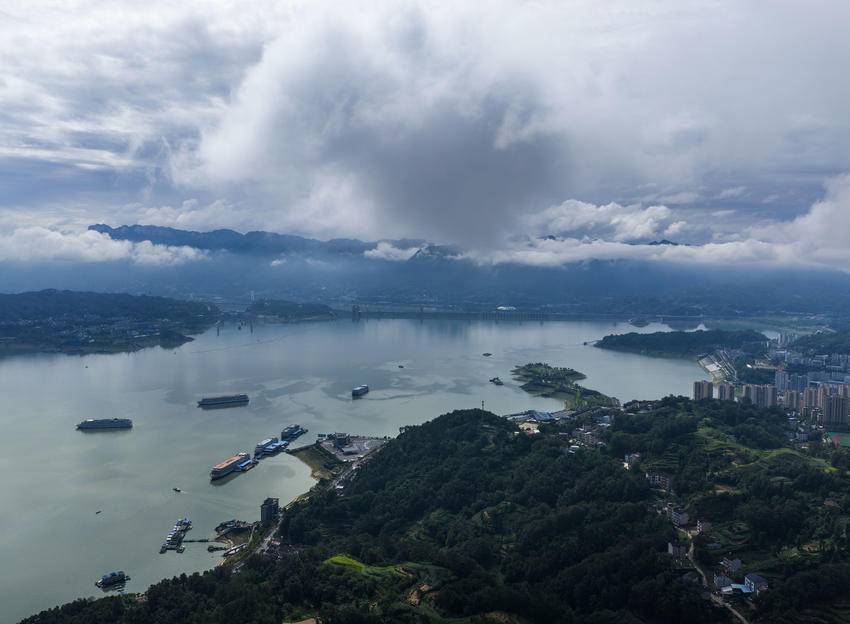 8月13日,轮船行驶在三峡大坝上游附近的湖北省秭归县茅坪镇水域(无人机照片)。