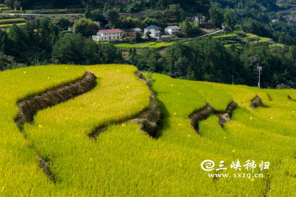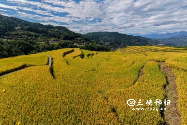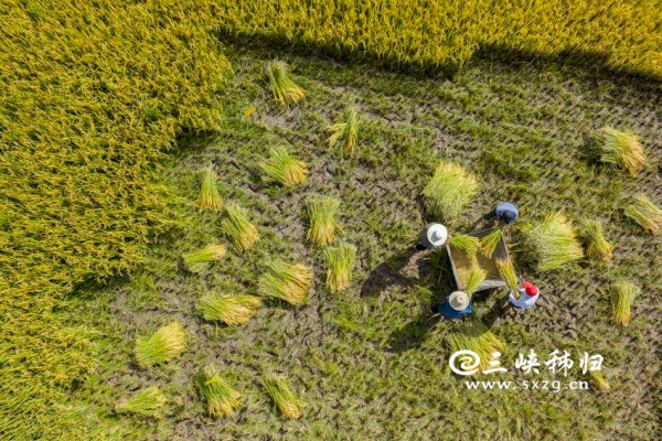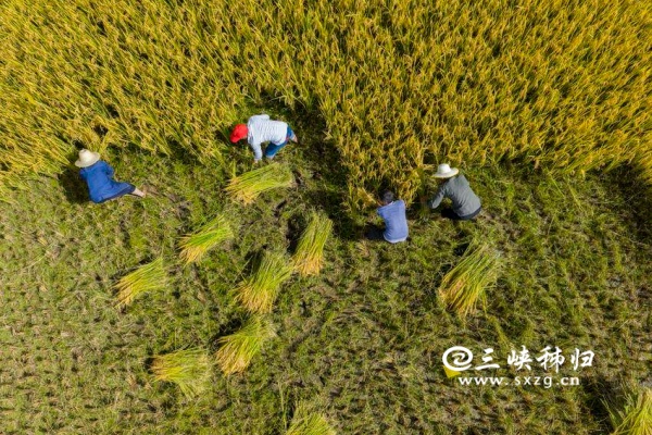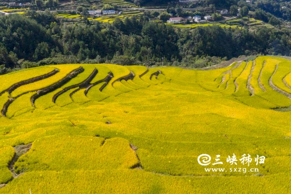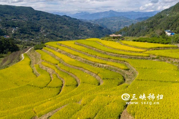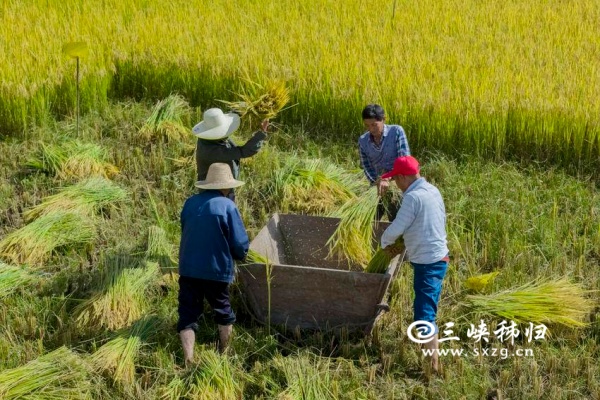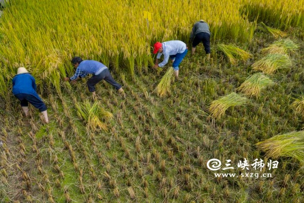 三峡秭归讯(通讯员 吴承忠)金秋时节,秭归县沙镇溪镇长春村高山水稻进入成熟季节,金灿灿的稻田“丰”景如画,当地粮农正抢抓农时开镰收割,呈现出一派丰收景象。
