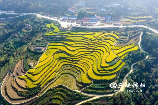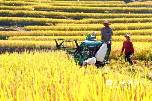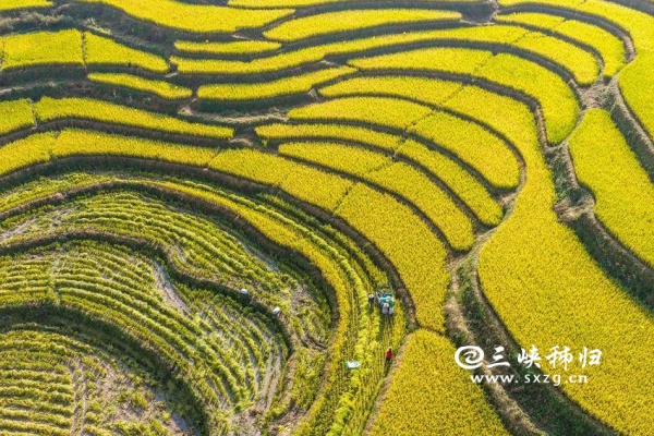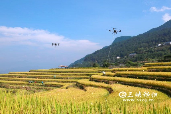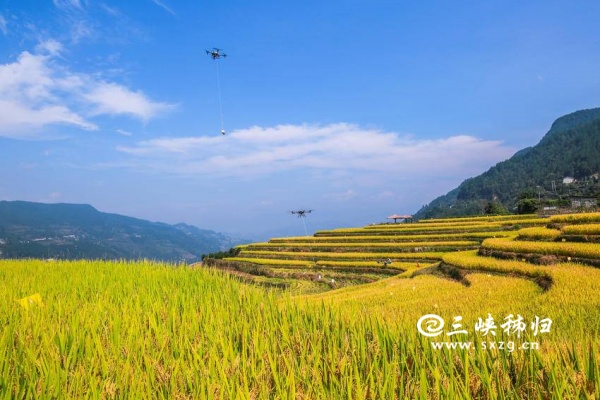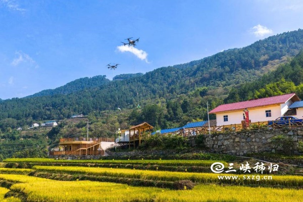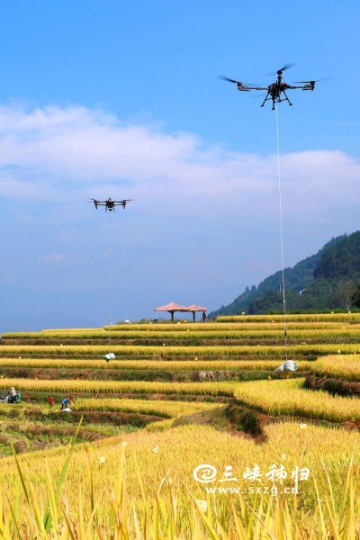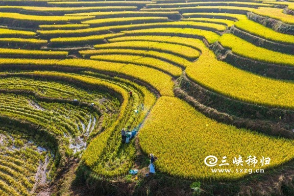 三峡秭归讯(通讯员 王罡 郑可欣)时下,秭归县高山冷水稻进入收获季。当地农民采用收割机、无人机等进行收割、搬运、贮藏,确保秋粮颗粒归仓,田间地头一派忙碌景象。层层叠叠的梯田、穿梭稻田的机器与翻修一新的民居构成了一幅美丽的现代乡村新画卷。冷水稻是用当地高山冷泉水灌溉稻田而发展的特色农产品,以其高品质深受市场青睐。
