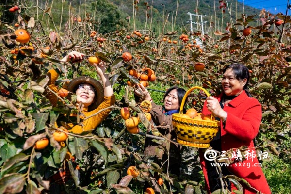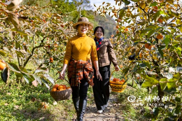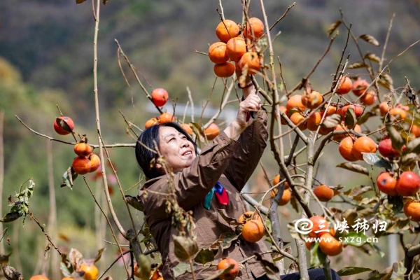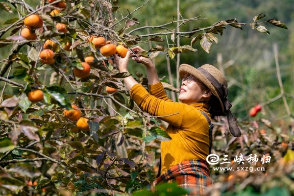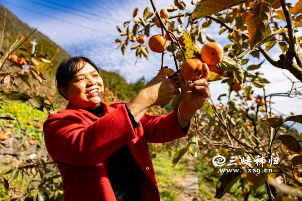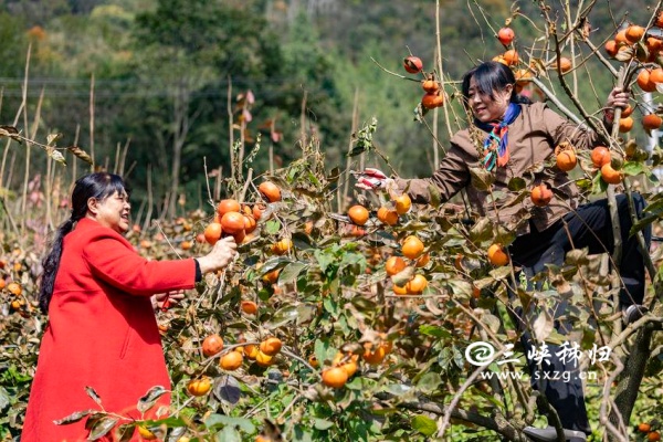 三峡秭归讯(通讯员 吴承忠)当下,秭归县九畹溪镇种植的苹果柿进入成熟采摘季,当地柿农抢抓晴好天气加紧采摘供应市场,确保丰产增收。图为11月20日,秭归县九畹溪镇峡口村苹果柿农正在果园内采摘成熟的苹果柿鲜果。