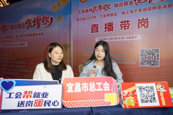 三峡秭归讯(通讯员 吴承忠 胡艳 熊路雨)11月21日晚,秭归县2025年“工会帮就业”线上线下专场招聘活动在九歌巷子举行,现场采取别开生面的“直播带岗”网上招聘和现场咨询招聘相结合的方式,吸引不少秭归择业者前来咨询应聘。本次活动由湖北省总工会主办,宜昌市总工会、宜昌市人力资源和社会保障局、秭归县总工会、秭归县人力资源和社会保障局承办,提供各种就业岗位1000多个,旨在有效促进和扩大秭归就业。