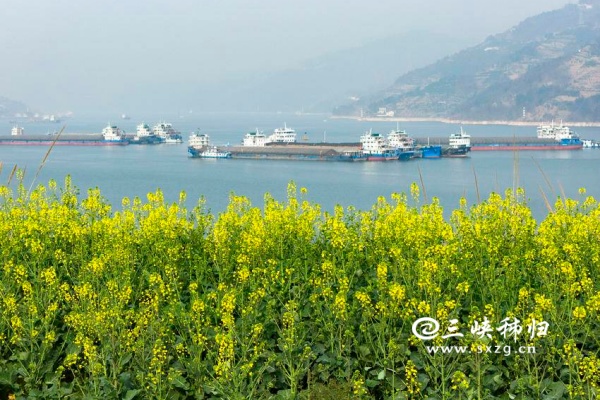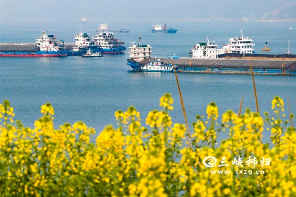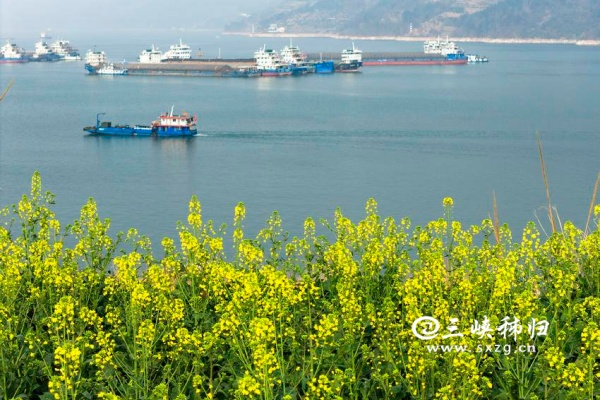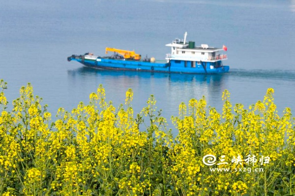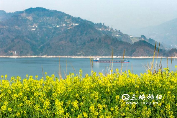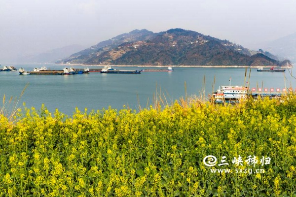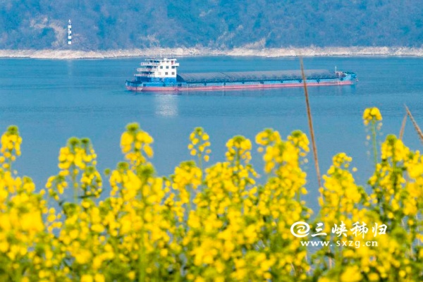 三峡秭归讯(通讯员 吴承忠)时下,长江三峡地区春风送暖,峡江两岸的油菜花次第开放,美不胜收。图为2026年2月8日,船舶航行在秭归县茅坪镇水域。