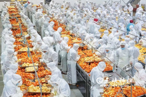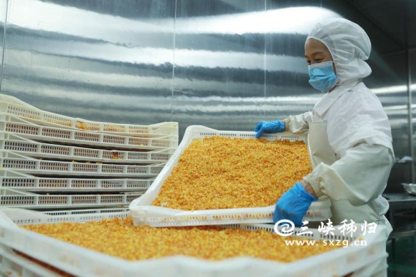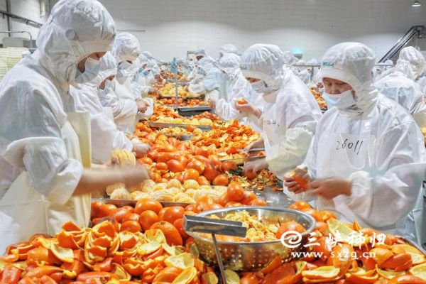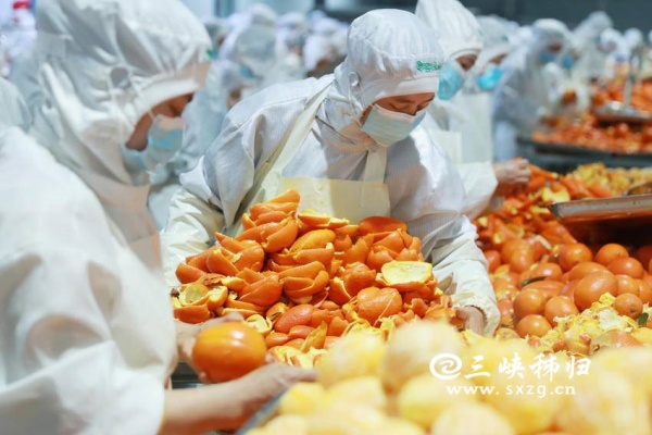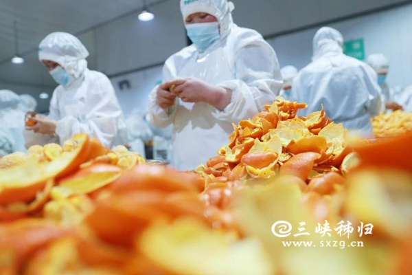 图为3月24日,湖北屈姑国际农业集团工人在秭归县水果车间制作糖渍橙皮丁。