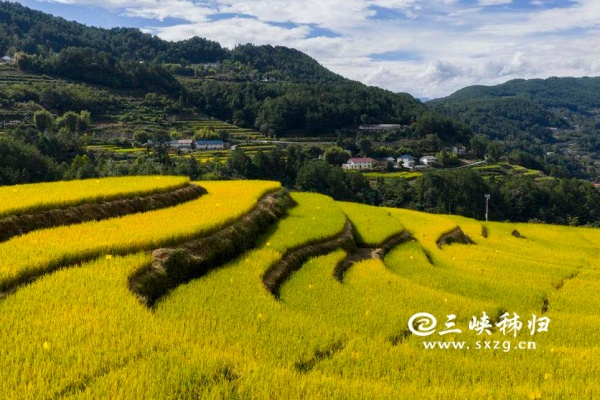 金秋时节,秭归县沙镇溪镇长春村高山水稻进入成熟季节,金灿灿的稻田“丰”景如画,当地粮农正抢抓农时开镰收割,呈现出一派丰收景象。