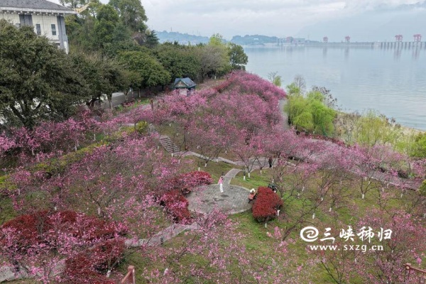 3月25日,秭归县屈原祠内桃花、樱花相继盛开,与三峡大坝相映成景,吸引游客前往观赏。