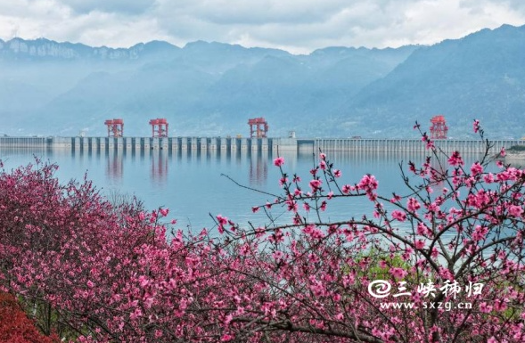 3月26日,秭归县茅坪城区凤凰山上桃花、樱花绽放正艳,浓浓春色将长江三峡大坝装扮得更加雄伟壮丽。