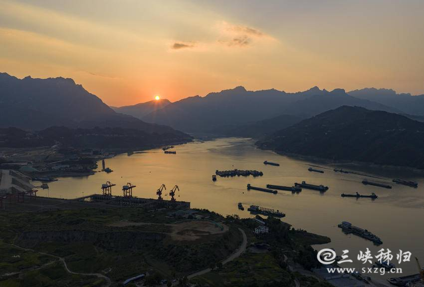 夕阳西下,长江三峡西陵峡秭归县茅坪江段,火红的霞光映红江面,江面船舶往来如梭,相映成景,美不胜收。
